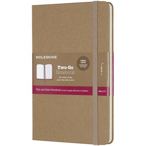 I taccuini Two-Go consentono di fissare le proprie idee in due diversi modi: da un lato a mano libera, senza limiti e spontaneamente e dall'altro con precisione, linearità e ponderatamente. Modalità di espressione convergenti e divergenti che rafforzano e danno libertà alle idee; doppio colore, doppio layout, doppio segnalibro e doppia creatività. Le due pagine affiancate, di cui una sempre a righe e l'altra bianca, forniscono lo spazio ideale per esprimersi in piena libertà. Grazie anche alla copertina in tela di cotone di diverso colore all'esterno e all'interno si può scegliere il taccuino che meglio si adatta alla propria avventura. · Copertina rigida in tela di cotone per una comoda esperienza di scrittura anche senza superficie di appoggio · Chiusura elastica · Carta da 100 g/m2, acid-free, color avorio · Etichetta \in case of loss\"" stampata nel risguardo · Doppio segnalibro, doppio layout (a righe e a pagine bianche), doppio colore (esterno e interno) · Sul B-side della fascetta riutilizzabile sono stampati strumenti aggiuntivi · Apertura a 180 gradi · All'interno, tutta la storia Moleskine