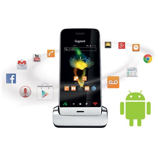 Caratteristiche tecniche: Telefono cordless con sistema operativo Android 4.0.4 Ice Cream Sandwich; Processore da 1 GHz; Memoria interna da 3 GB con slot per MicroSD sino a32 GB; Interfaccia utente touch con 5 tasti fisici dedicati; Display multitouch AMOLED da 3.2" a 16,7 milioni di colori, VA (ampio angolo di visuale),resistente ai graffi; Connessione ad internet tramite Wi-Fi; Apps Google e Play Store (email, internet browser, maps, etc.); Compatibile con Applicazione Skype; MP3 player; Foto e video gallery; Visualizzatore video anche in streaming da YouTube; Audio con suono limpido e brillante; Vivavoce di qualità Hi Fi- compatibile con clip vivavoce L410; < Conference call; Jack da 3,5 mm (per attacco cuffie stereo); Micro USB 2.0; Sistema Green Home di 2a generazione ad alta efficienza energetica e zero radiazioni- Segreteria telefonica (55 min. di memoria); Fino a 6 portatili configurabili; Portata segnale fino a 50/300 m (interno/esterno); Funzionalità "Privacy" per gestire le chiamate indesiderate; Calendario; Rubrica con associazione della foto del chiamante; Sveglia; Blocco tastiera; Vibracall.